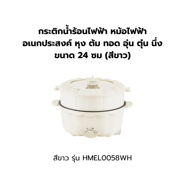 กระติกน้ำร้อนไฟฟ้า หม้อไฟฟ้าอเนกประสงค์ หุงข้าว ต้ม ทอด อุ่น ตุ๋น นึ่ง ขนาด 24 ซม (สีขาว) รุ่น HMEL0058WH