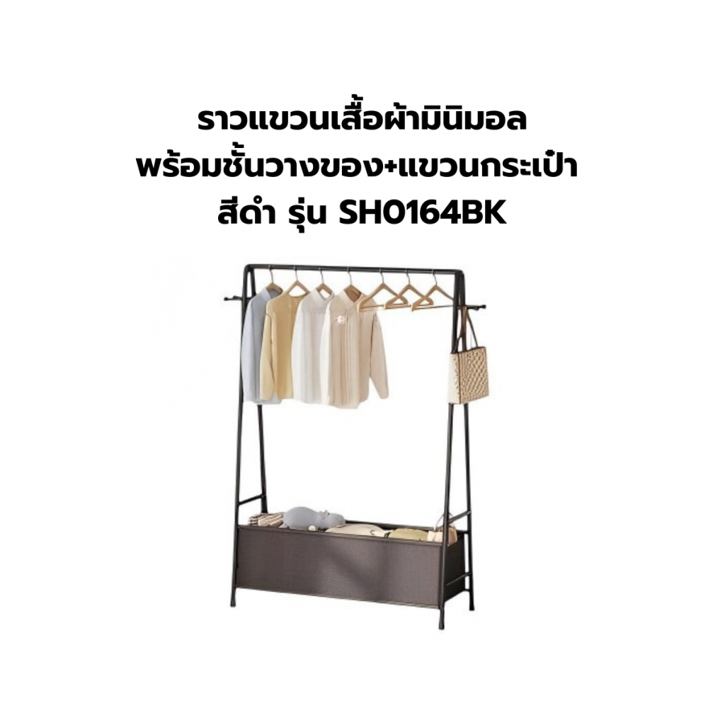 ราวแขวนเสื้อผ้ามินิมอลพร้อมชั้นวางของ+แขวนกระเป๋า สีดำ รุ่น SH0164BK