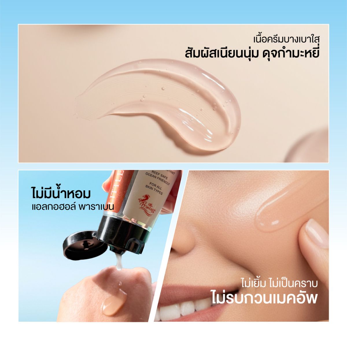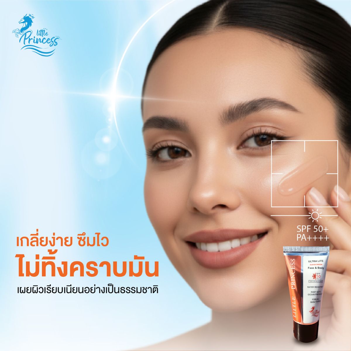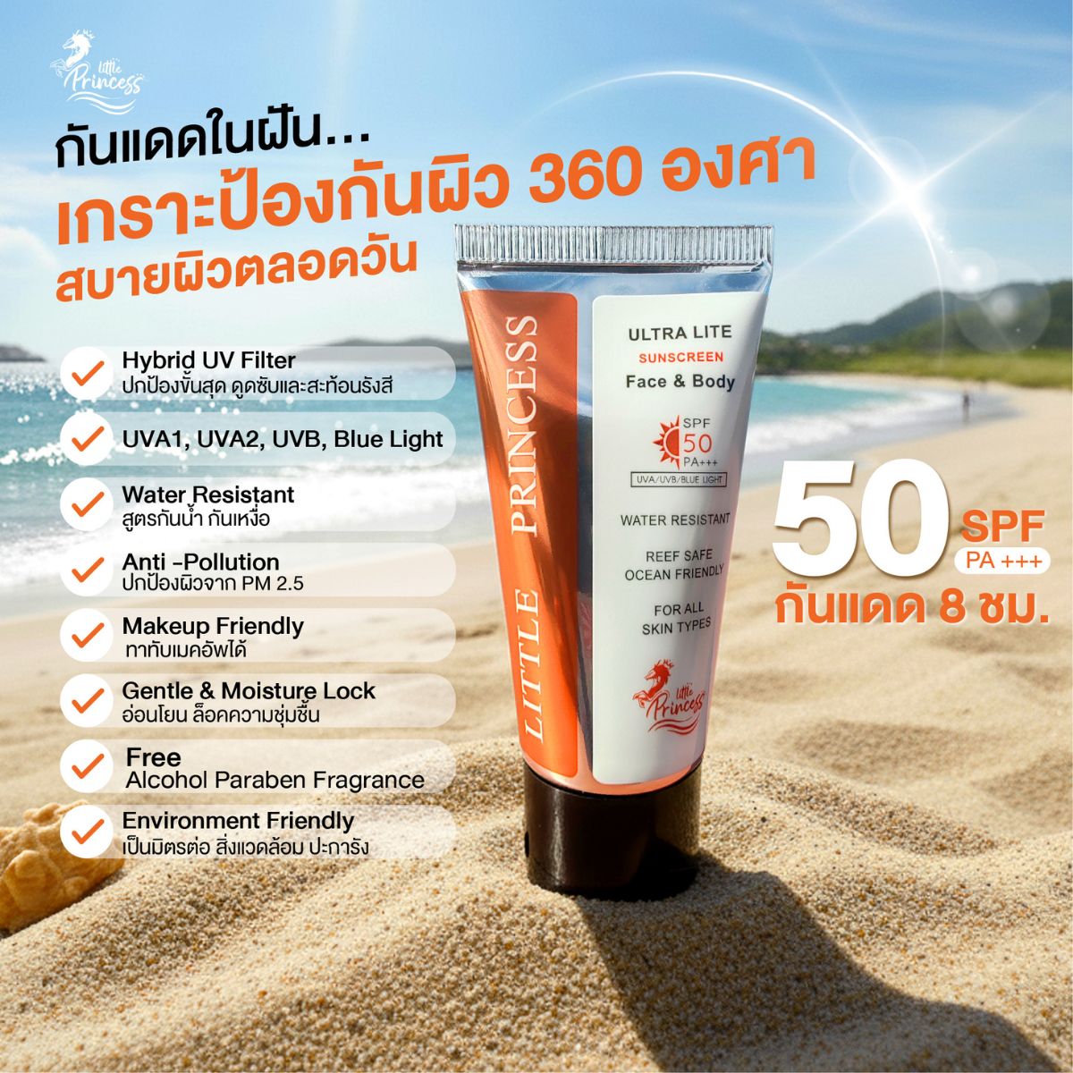 Little Princess Ultra Lite Sunscreen ยังออกแบบมาให้เป็นมิตรต่อสิ่งแวดล้อม ด้วยสูตร Reef Safe และ Ocean Friendly ปราศจากสารเคมีที่เป็นอันตรายต่อปะการังและระบบนิเวศทางทะเล จึงเป็นตัวเลือกของกันแดดที่ดูแลทั้งผิวและโลกไปพร้อมกัน