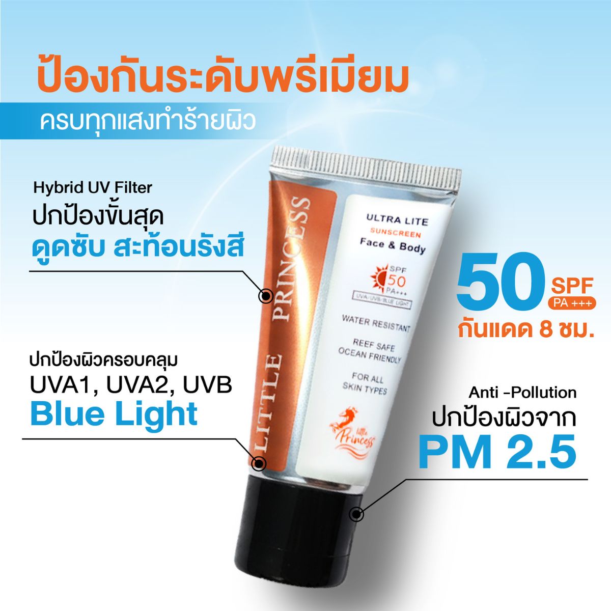 Little Princess Ultra Lite Sunscreen Face & Body ครีมกันแดดเนื้อบางเบาที่ออกแบบมาเพื่อการปกป้องผิวอย่างมีประสิทธิภาพ พร้อมใส่ใจต่อสิ่งแวดล้อม เหมาะสำหรับการใช้ได้ทั้งผิวหน้าและผิวกาย ช่วยปกป้องผิวจากแสงแดดในชีวิตประจำวัน พร้อมให้ความรู้สึกสบายผิวตลอดวัน
