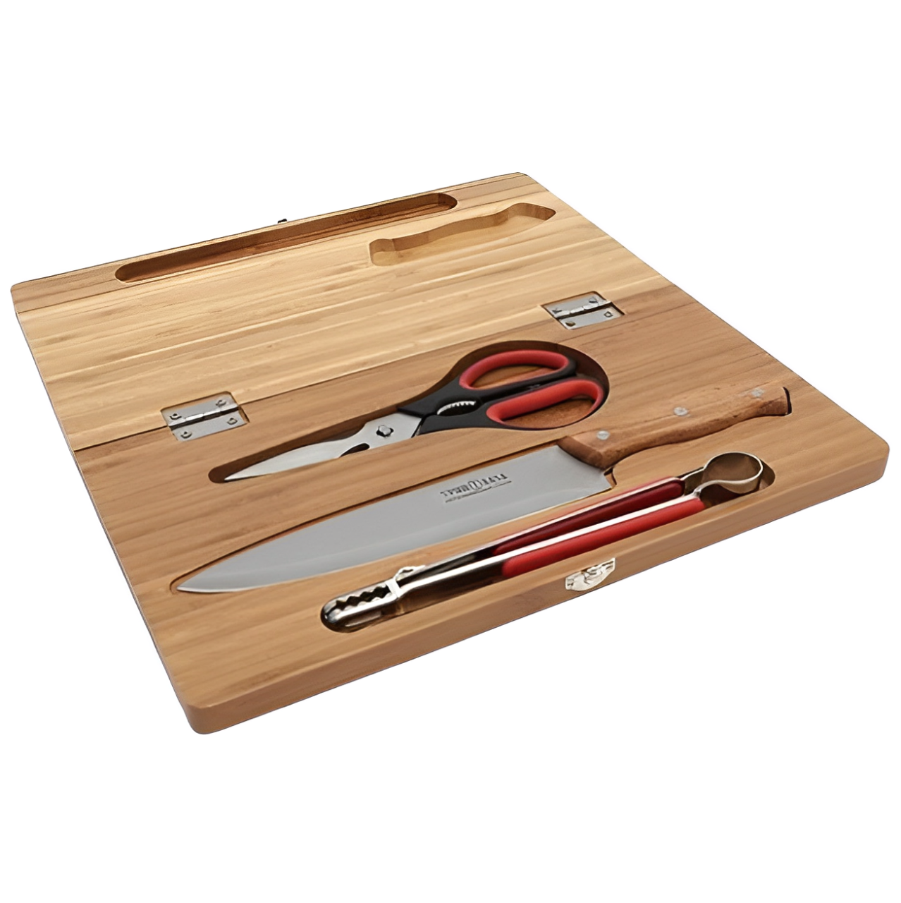 ชุดมีดเขียง Chanodug เหมาะสำหรับ ตัวเขียงวัสดุทำจาก ไม้เนื้อแข็ง ให้ความทนทานและ สวยงาม ตัวมีดทำจาก สแตนเลสเกรดดี เหมาะสำหรับ การทำครัว ในพื้นที่ Camping และ ยังมีที่คีบอาหาร มาในชุด พร้อมกระเป๋า จัดเก็บ สะดวกในการพกพา