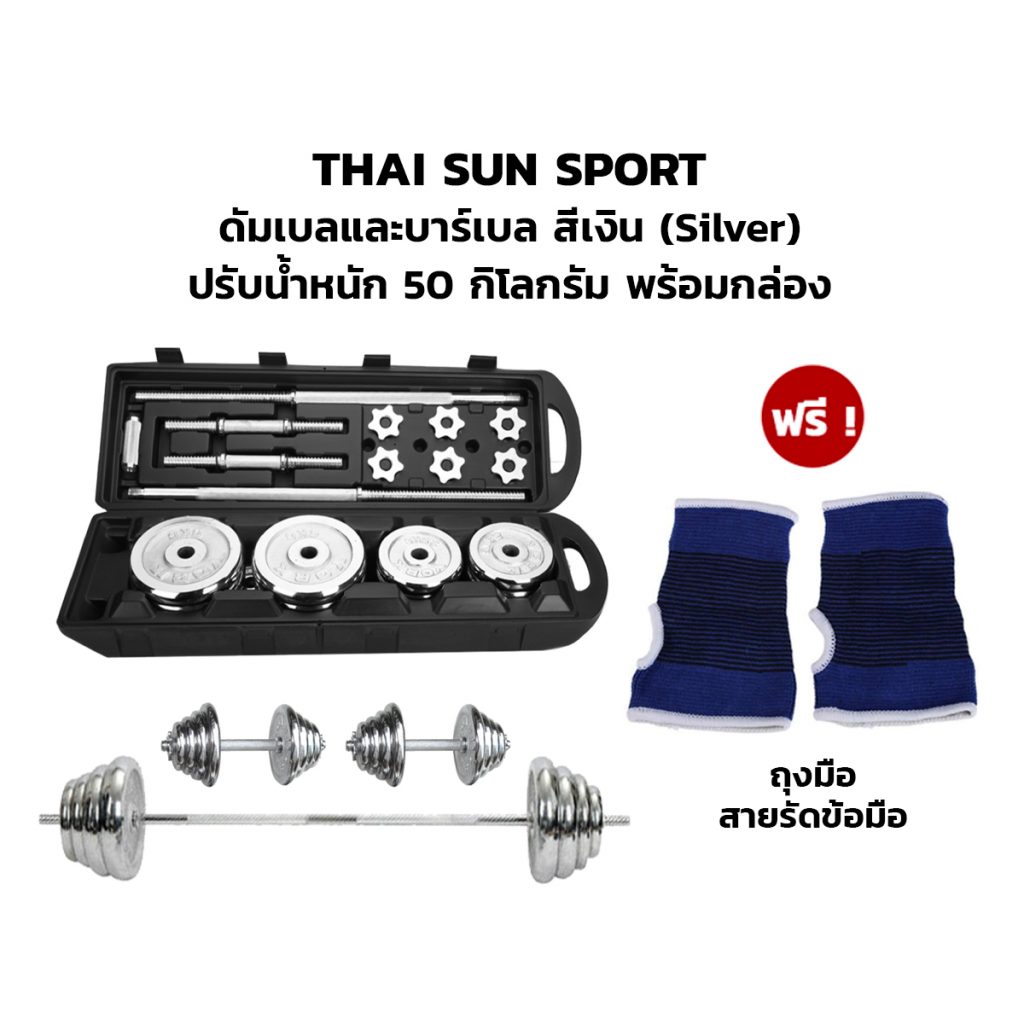 THAI SUN SPORT ดัมเบลและบาร์เบล สีเงิน (Silver) ปรับน้ำหนัก 50 กิโลกรัม พร้อมกล่อง ฟรี!! ถุงมือ+สายรัดข้อมือ