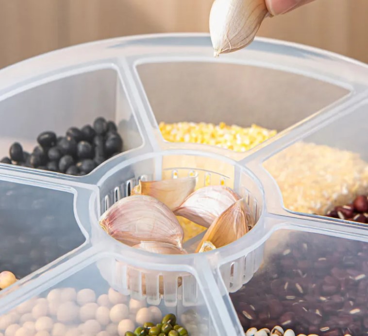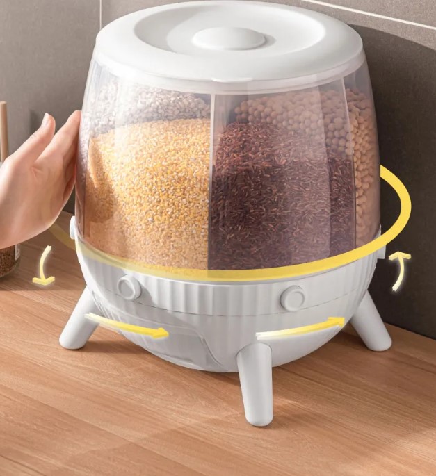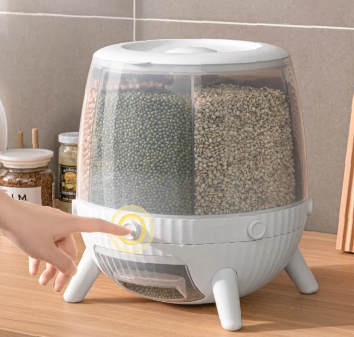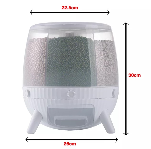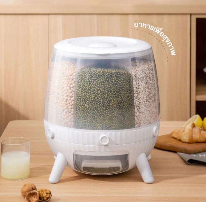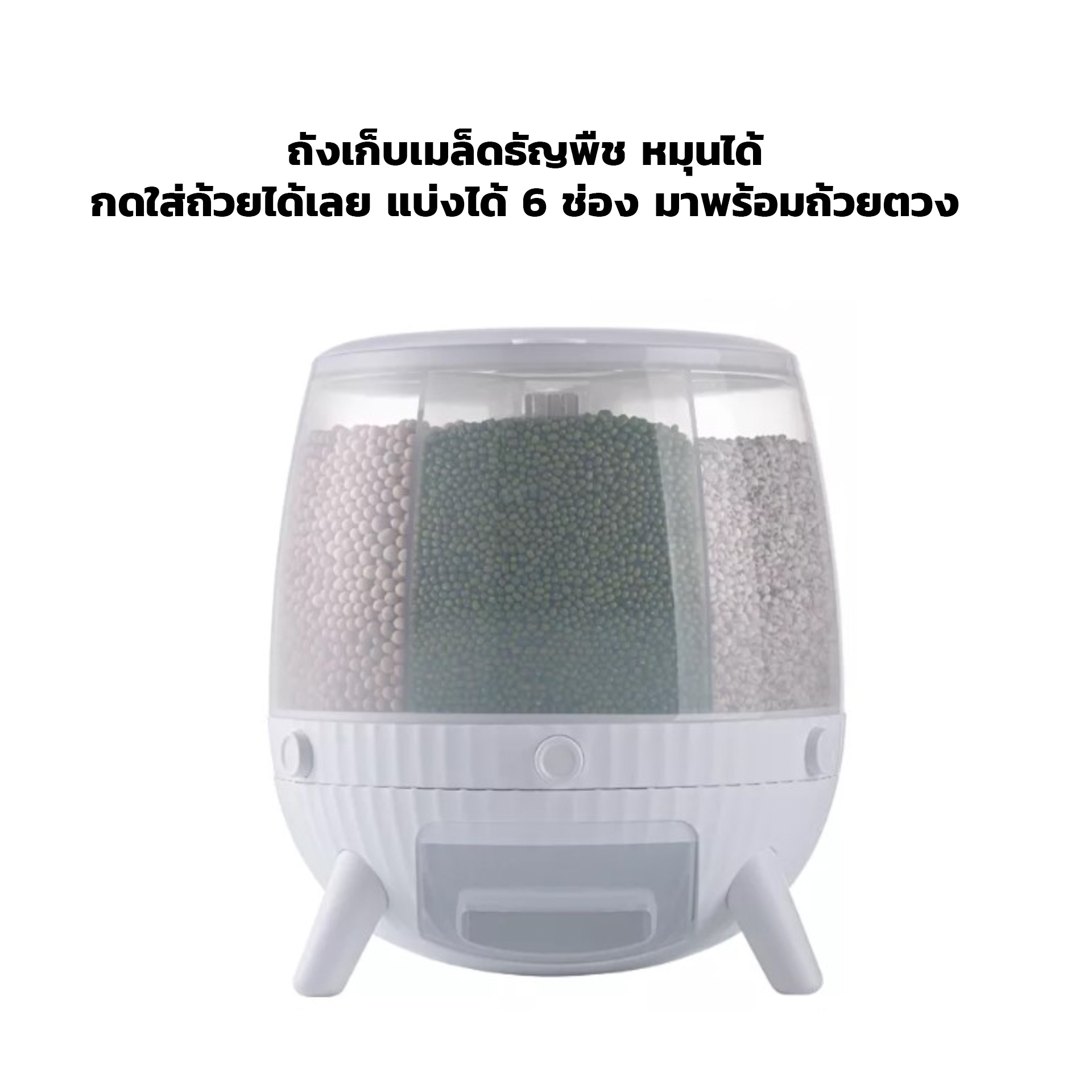 ถังเก็บเมล็ดธัญพืช หมุนได้ กดใส่ถ้วยได้เลย แบ่งได้ 6 ช่อง มาพร้อมถ้วยตวง