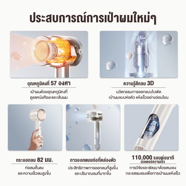 ด้วยมอเตอร์แบบไร้แปรงถ่านความเร็วสูง 110,000 รอบต่อนาทีเครื่องเป่าผมสามารถสร้างพลังลมได้ในทันทีซึ่งช่วยเป่าให้เส้นผมแห้งเร็วโดยไม่ทําลายเส้นผม