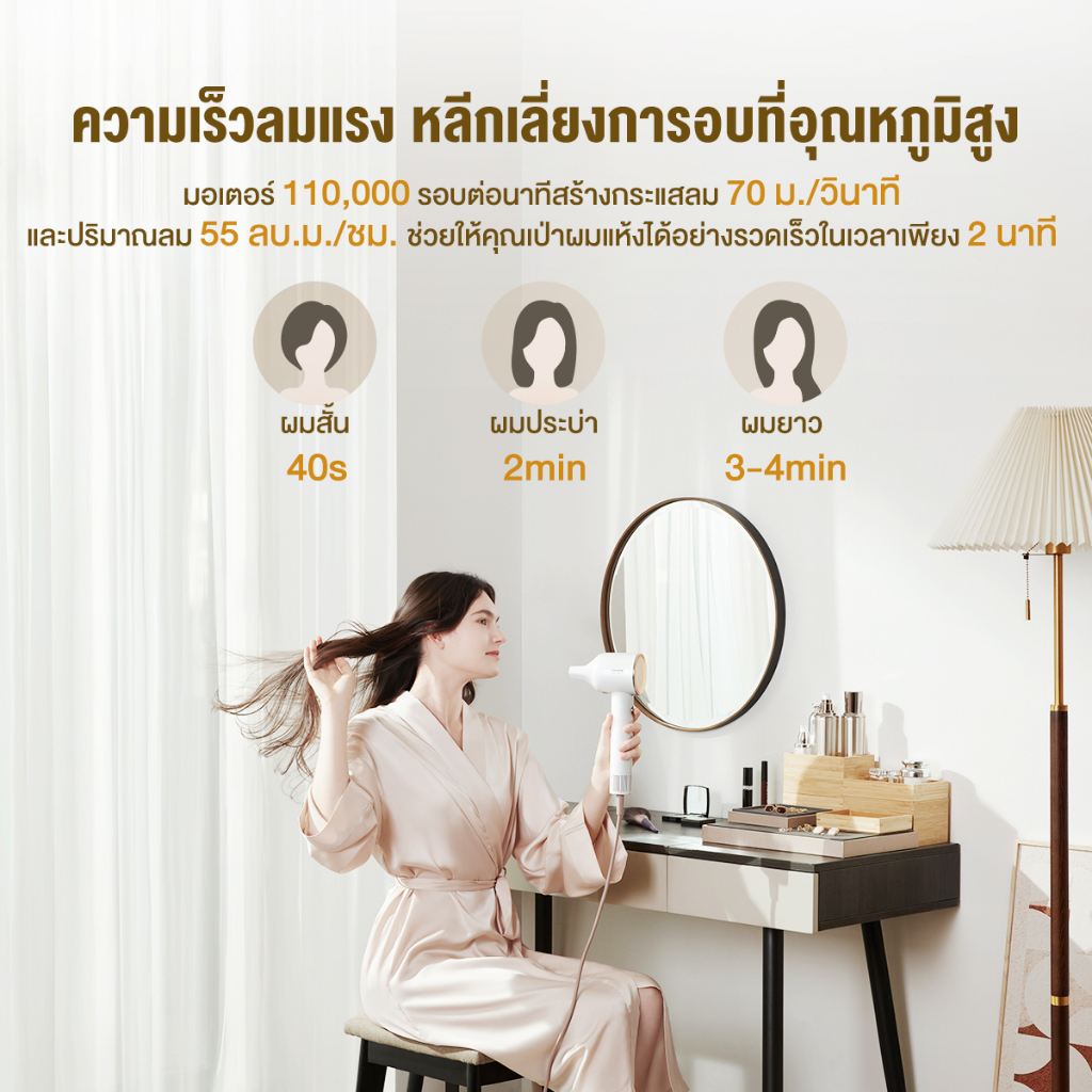 ด้วยมอเตอร์แบบไร้แปรงถ่านความเร็วสูง 110,000 รอบต่อนาทีเครื่องเป่าผมสามารถสร้างพลังลมได้ในทันทีซึ่งช่วยเป่าให้เส้นผมแห้งเร็วโดยไม่ทําลายเส้นผม