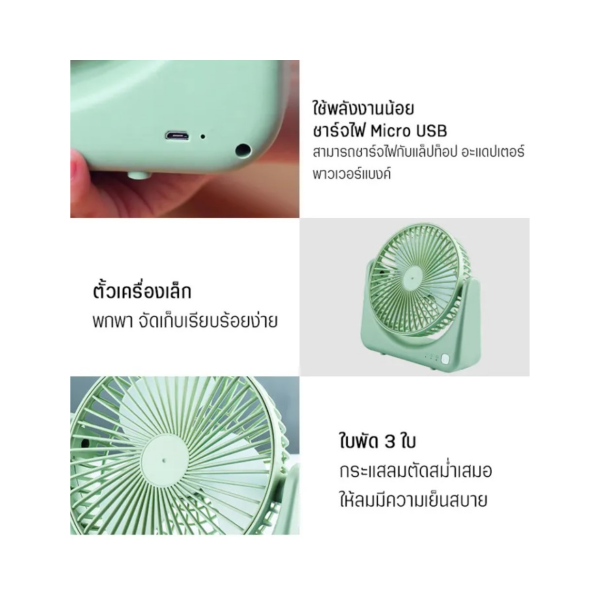 ชาร์จไฟบ้าน ทนทาน พกพาสะดวกความแรงปรับระดับได้ 3 ระดับชาร์จไฟ : 3 ชั่วโมงทนทาน : 3-12 ชั่่วโมงแบตเตอรี่ลิเธี่ยม : 1200 mAhพัดลมสามารถปรับขึ้นลงได้