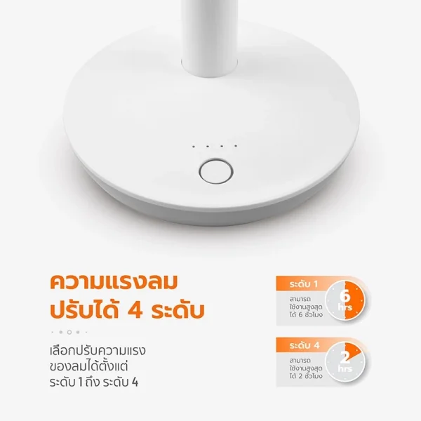 แรงลมปรับได้ 4 ระดับ ควบคุมการทำงานด้วยปุ่มเดียว ความจุแบตเตอรี่ 3500 mAh ใช้งานแรงสุดได้ถึง 6 ชั่วโมง สายชาร์จ Micro USB 1.2 m ชาร์จเต็มภายใน 3 ชั่วโมง ปรับก้ม-เงยได้ 90 องศา วัสดุตัวเครื่องทำจาก ABS+PC แข็งแรง