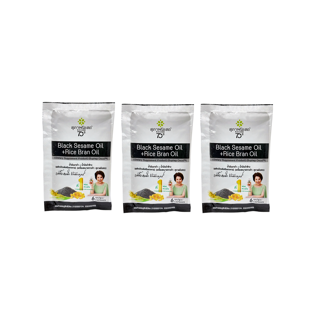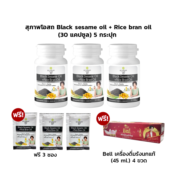 สุภาพโอสถ Black sesame oil + Rice bran oil (30 แคปซูล) 5 กระปุก ฟรี 3 ซอง แถม Bell เครื่องดื่มรังนกแท้ (45 ml.) 4 ขวด