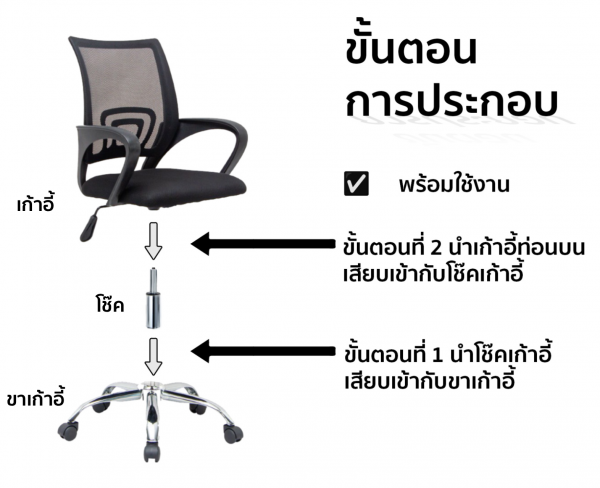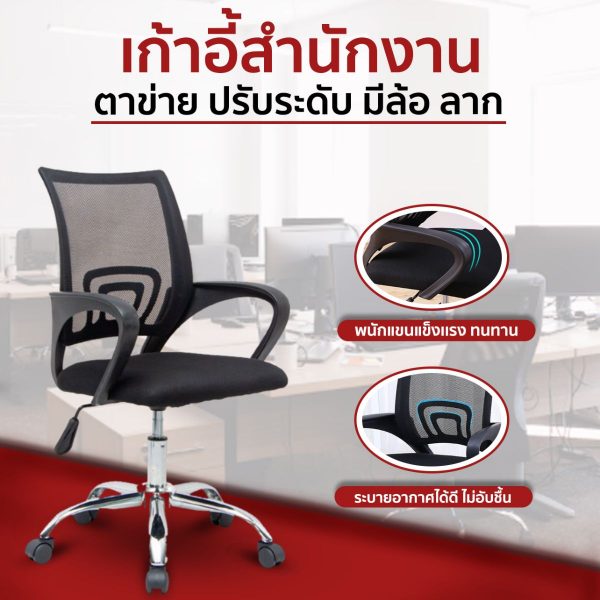 เก้าอี้สำนักงาน พนักพิงกลางหลัง ผ้าตาข่าย รับสรีระ ปรับระดับสูง-ต่ำ รับน้ำหนัก 100 kg ล้อเลื่อน หมุน 360 องศา วัสดุการผลิต : เหล็กชุบโครเมียม (Chrome Base), พลาสติก PP (Polypropylene), ผ้าตาข่าย (Mesh Fabric), ฟองน้ำ