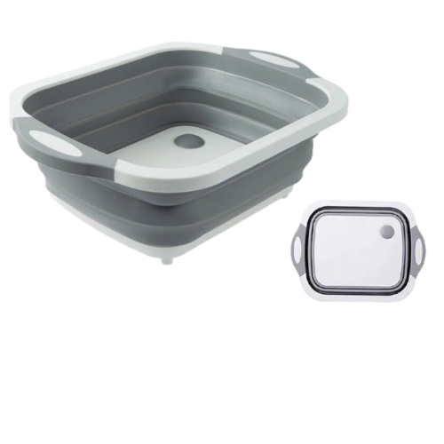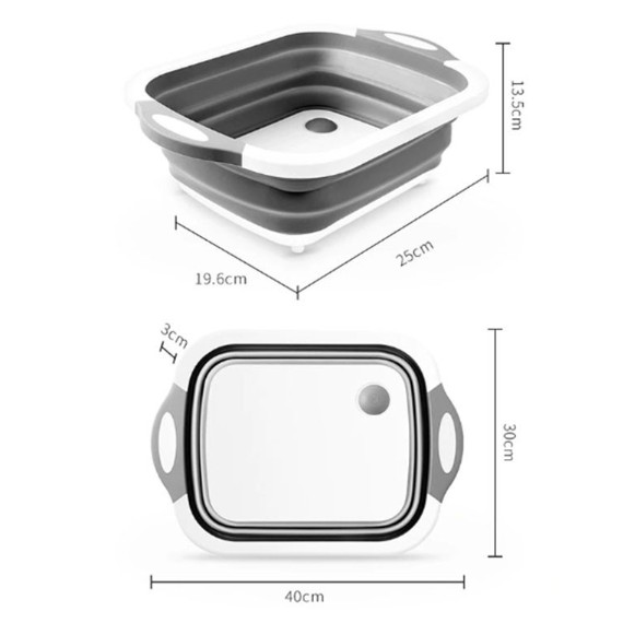 -ใช้เป็นกะละมังล้างผัก เตรียมของได้ มีรูระบายน้ำในตัว เมื่อพับจะสามารถใช้เป็นเขียงได้