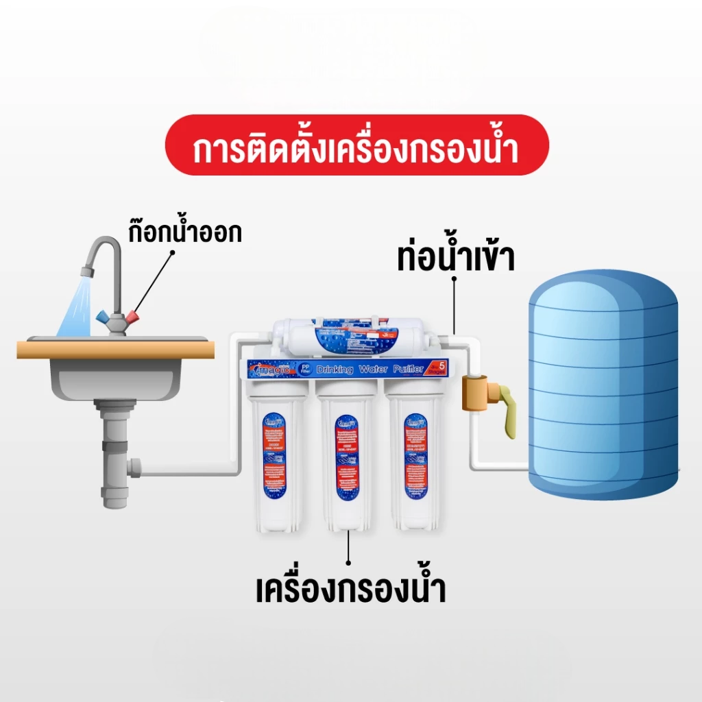 ใส้กรอง 5 : ไส้กรองน้ำ Post Carbon 10″ สำหรับดักจับกลิ่นปรับรสชาติ กลิ่นคลอรีนเชื้อโรคแบคทีเรีย ต่างๆ ชวนให้น่าดื่ม และสีที่อาจเกิดจากกระบวนการข้างต้น ก่อนไปบริโภคอีกครั้งหนึ่ง