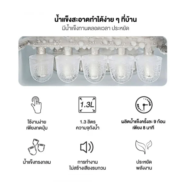 – สามารถผลิตน้ำแข็งได้ 9 ก้อนใน 6-13 นาที และผลิตอย่างต่อเนื่อง