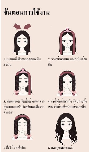 【วิธีใช้】ก่อนนอน ให้ม้วนผมด้วยริบบิ้นม้วนผม พันผมรอบแกนม้วนผม 2 อัน มัดด้วยกระดุม แล้วพันไว้รอบศีรษะ ตื่นเช้าก็ม้วนได้ เพิ่มลอนผมที่น่าทึ่งโดยไม่ต้องเสียเวลา