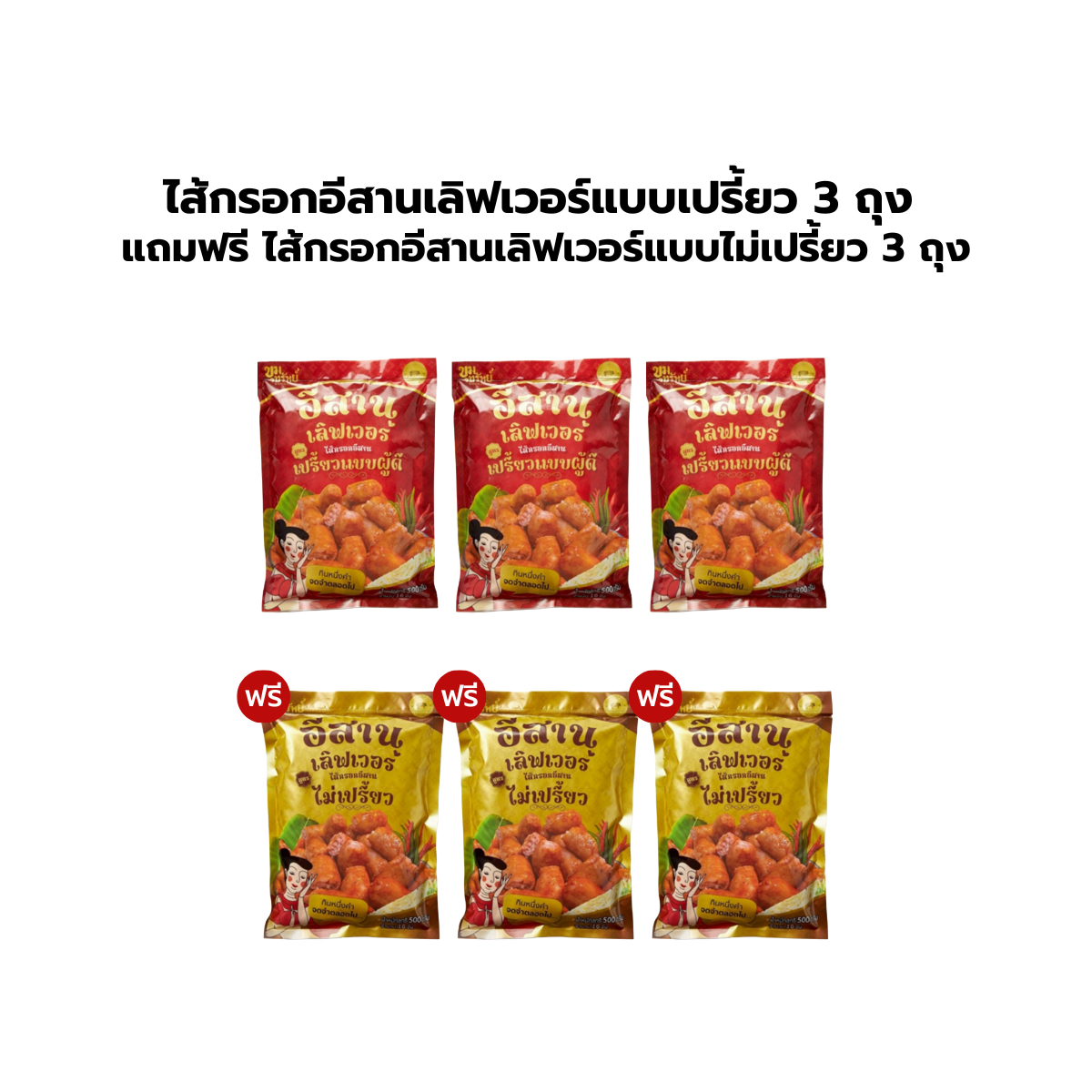 ไส้กรอกอีสานเลิฟเวอร์แบบเปรี้ยว 3 ถุง แถมฟรี ไส้กรอกอีสานเลิฟเวอร์แบบไม่เปรี้ยว 3 ถุง