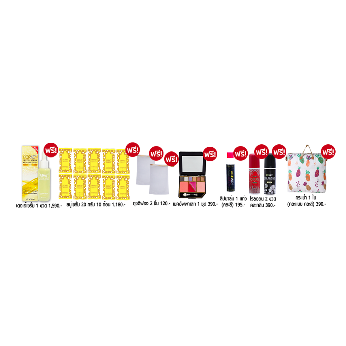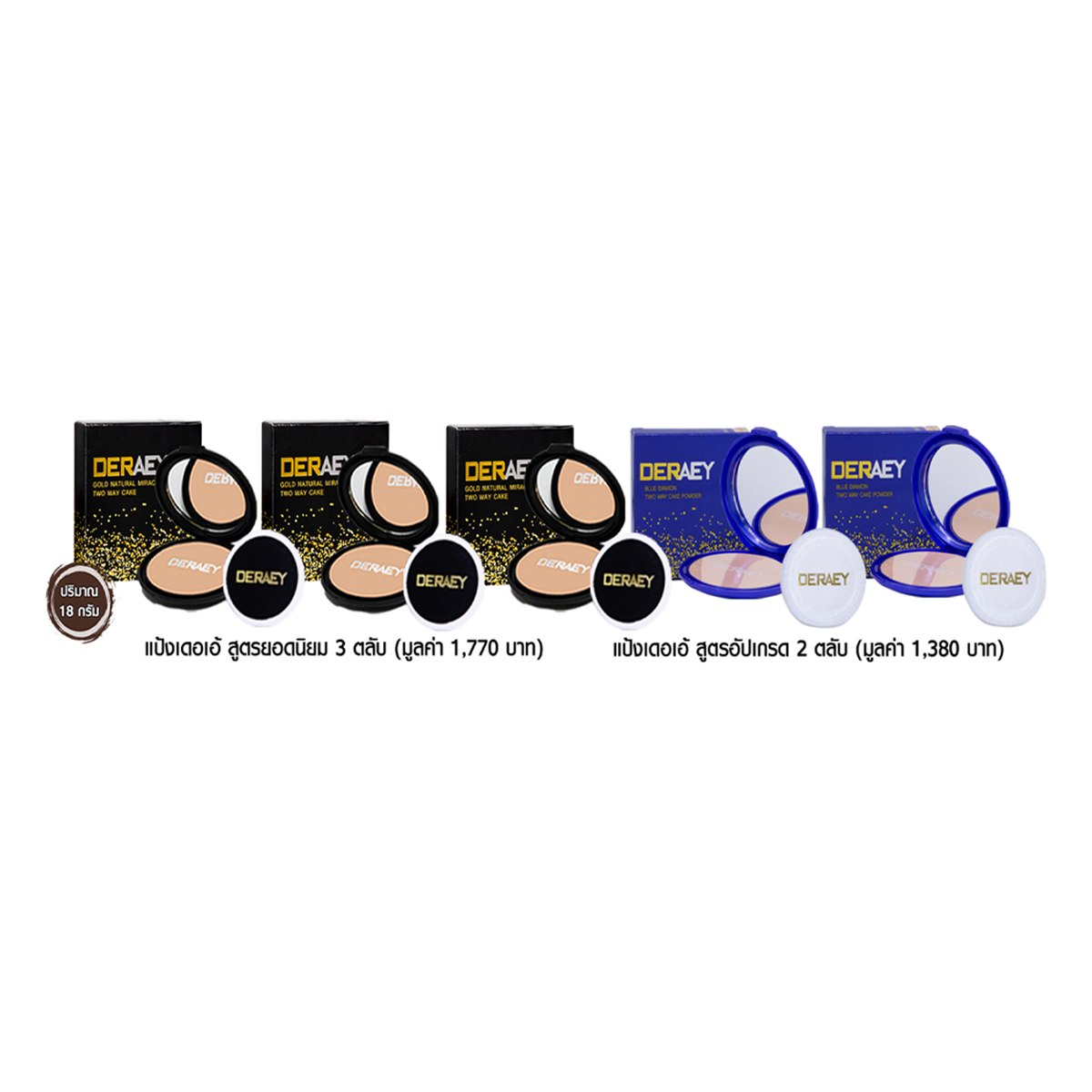 DERAEY เซตแป้งกันแก่ตลับดำ 5 ตลับ แถมฟรี เดอเอ้เซรั่ม 1 ขวด + สบู่เซรั่ม 20 กรัม 10 ก้อน + ถุงตีฟอง 2 ชิ้น + เมคอัพพาเลท 1 ชุด + ลิปบาล์ม 1 แท่ง(คละสี) + โรลออน 2 ขวด(คละกลิ่น) + กระเป๋า 1 ใบ(คละแบบ) (NO.01 ผิวขาว)