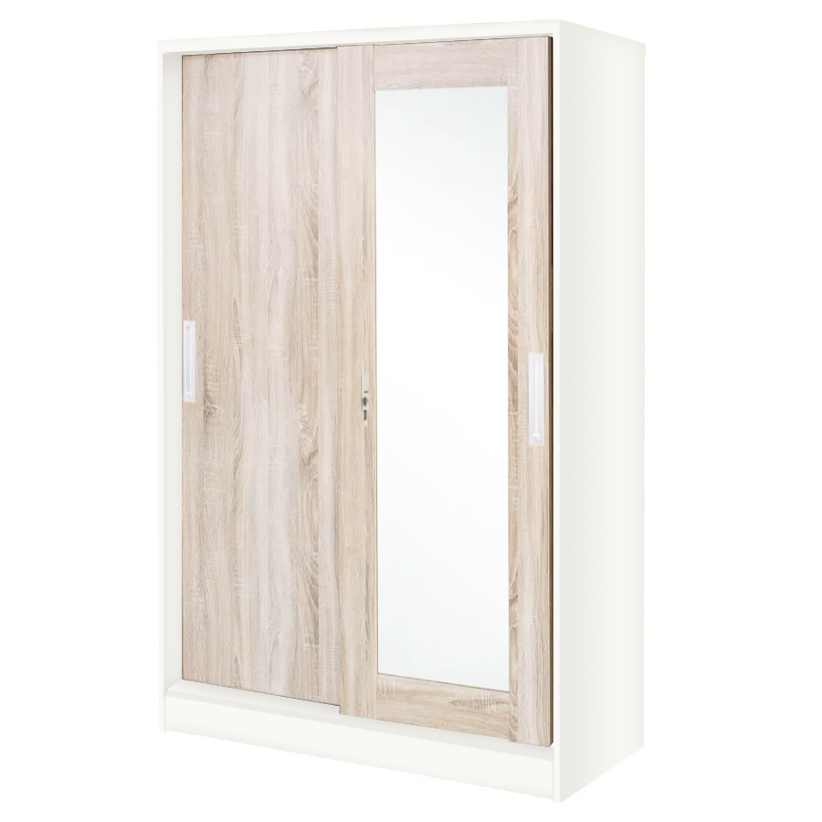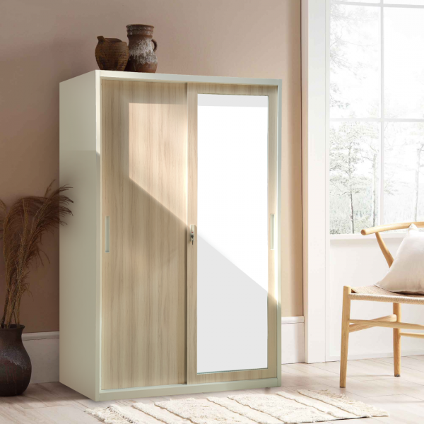 MEDILA ตู้เสื้อผ้าเหล็ก ล็อกเกอร์ เหล็ก บานเลื่อน 2ประตู กระจกเงา สีขาว ลายไม้สีเบจ รุ่น SH0206WH-WD-BE