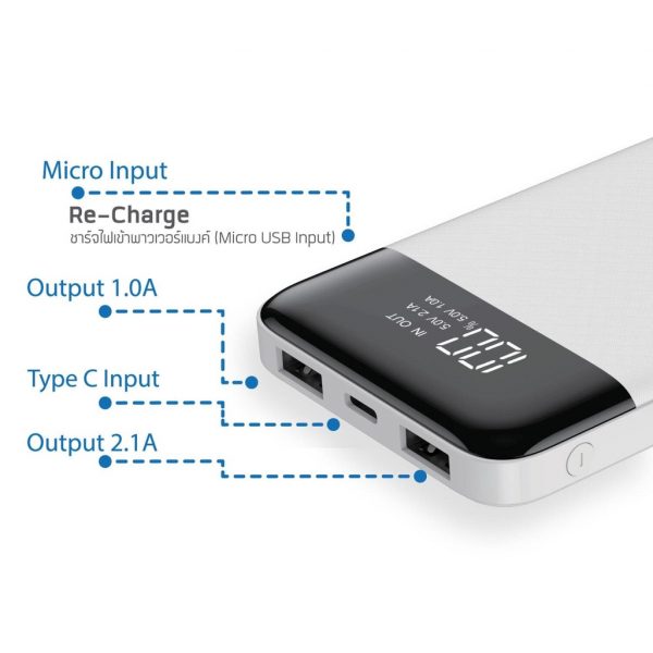 อุปกรณ์สำรองไฟแบบพกพา ผลิตจากแบตเตอรี่ลิเทียมโพลีเมอร์ ความจุสูงสุด 10000 mAh. หน้าจอแสดงผลแบบ LED ช่องเสียบ USB จำนวน 2 ช่อง รองรับช่องเสียบ Type – C และ Micro USB มีน้ำหนักเบา ขนาดเล็ก พกพาสะดวก พร้อมสายชาร์จ Micro USB ยาว 20 ซม. สินค้ามี มอก.
