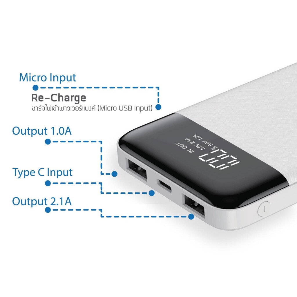 อุปกรณ์สำรองไฟแบบพกพา ผลิตจากแบตเตอรี่ลิเทียมโพลีเมอร์ ความจุสูงสุด 10000 mAh. หน้าจอแสดงผลแบบ LED ช่องเสียบ USB จำนวน 2 ช่อง รองรับช่องเสียบ Type – C และ Micro USB มีน้ำหนักเบา ขนาดเล็ก พกพาสะดวก พร้อมสายชาร์จ Micro USB ยาว 20 ซม. สินค้ามี มอก.