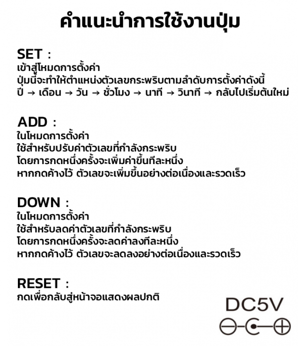 * หน้าจอแสดงเป็นตัวเลข แสดงผล เป็น วัน , วันที่ , เดือน , ปี และ อุณหภูมิ