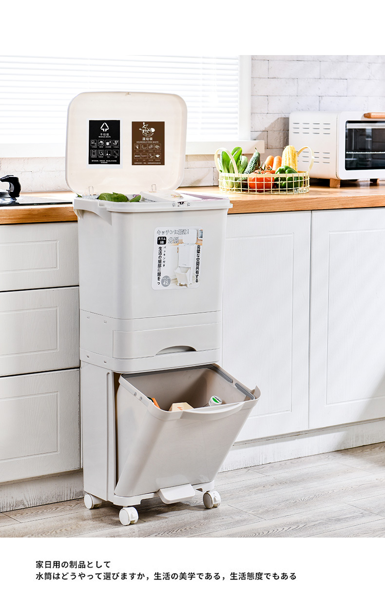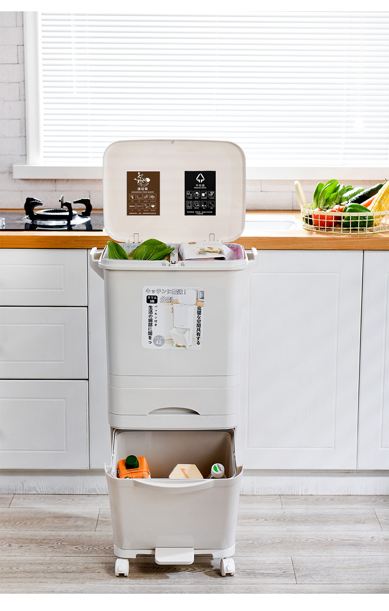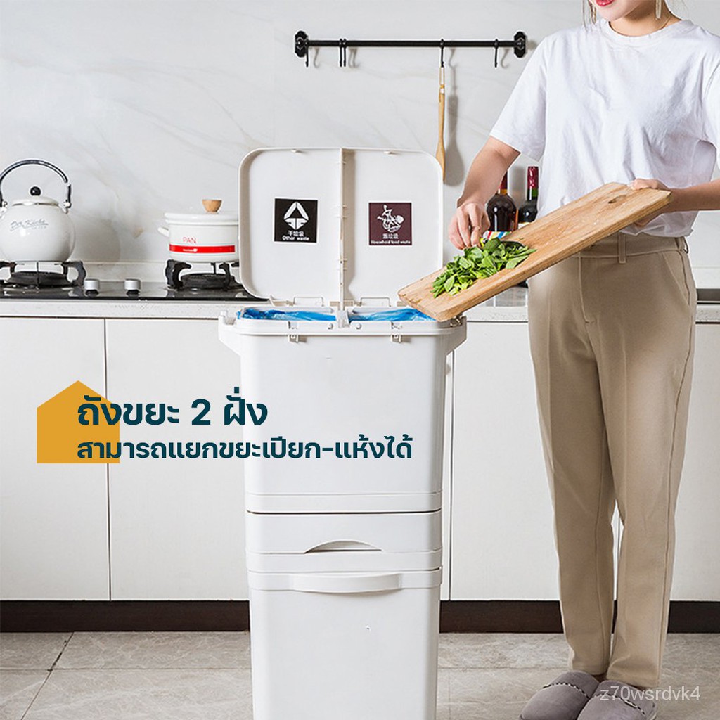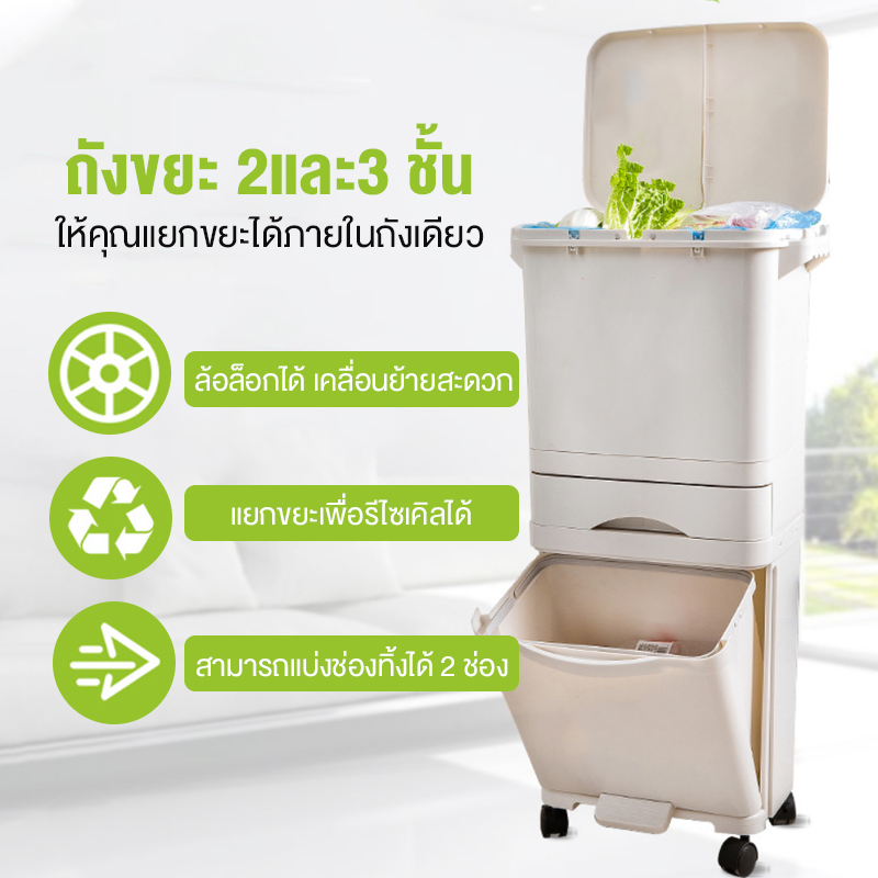TS Modern Living ถังขยะมีฝาปิด แยกขยะเปียก-แห้ง ขยะรีไซเคิล (42 ลิตร 3 ชั้น พร้อมลิ้นชักเก็บของ) ล้อเลื่อน ล็อคได้ หมุน 360 องศา CLEANING0003