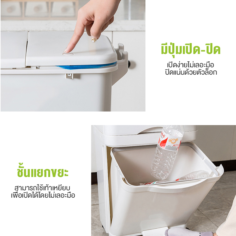 ถังด้านล่างสามารถใช้เท้าเหยียบเพื่อเปิดออกหลีกเลี่ยงการใช้มือสัมผัส สามารถเลือกใช้เป็นถังสำหรับขยะรีไซเคิลได้