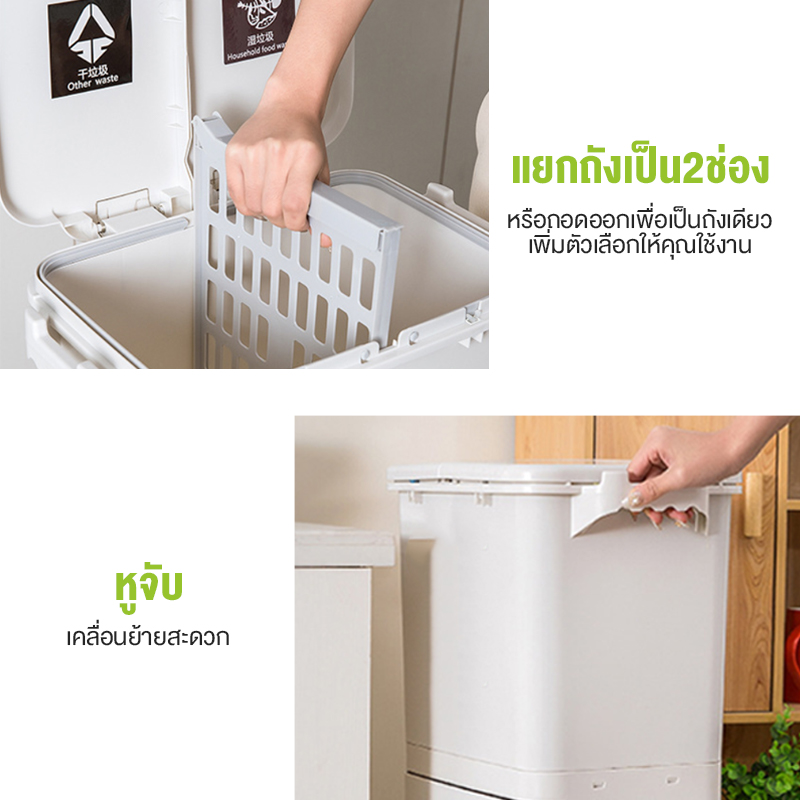 ถังด้านบนสามารถใส่ตะแกรงกั้นเป็น 2 ถัง ให้คุณแยกขยะได้ภายในถังเดียว