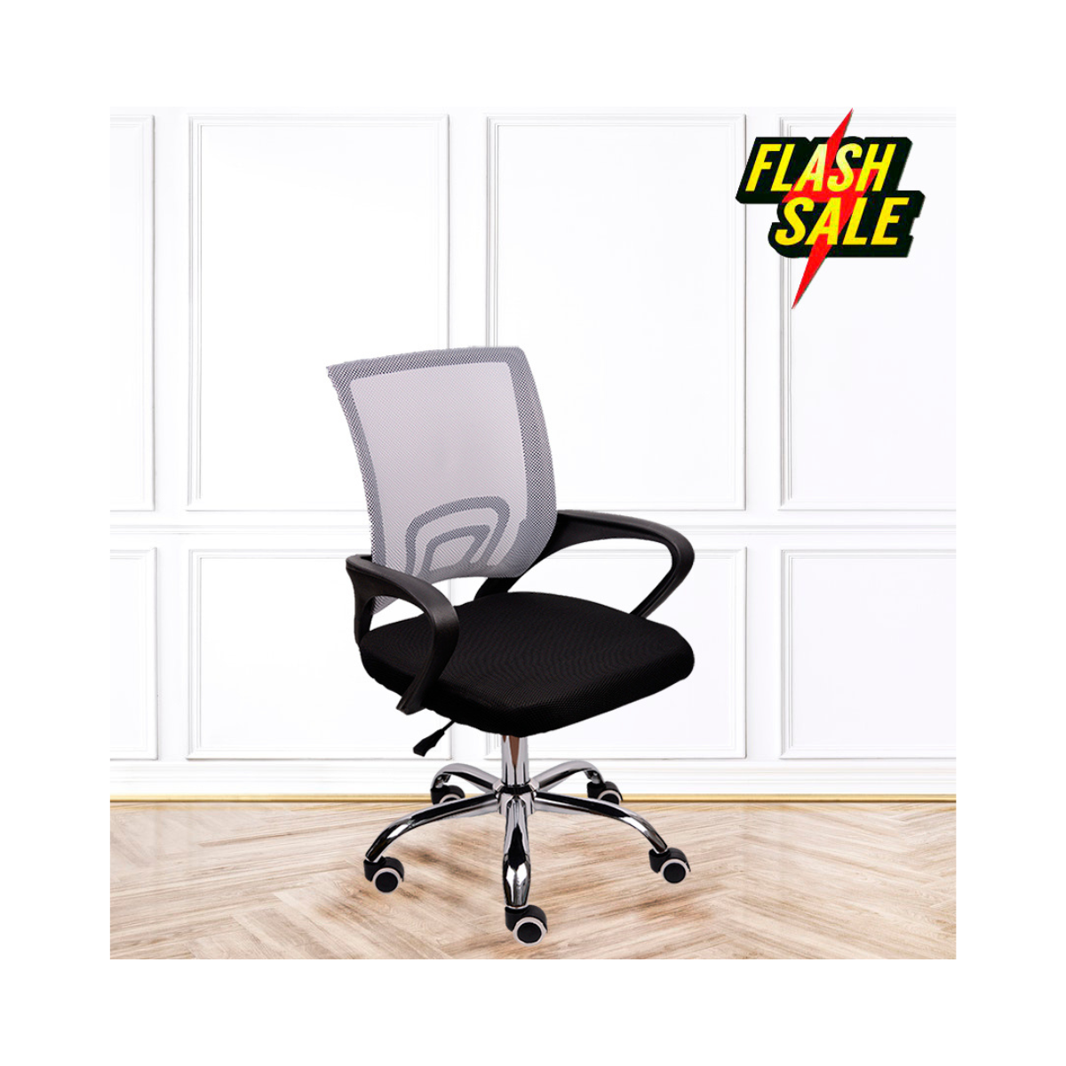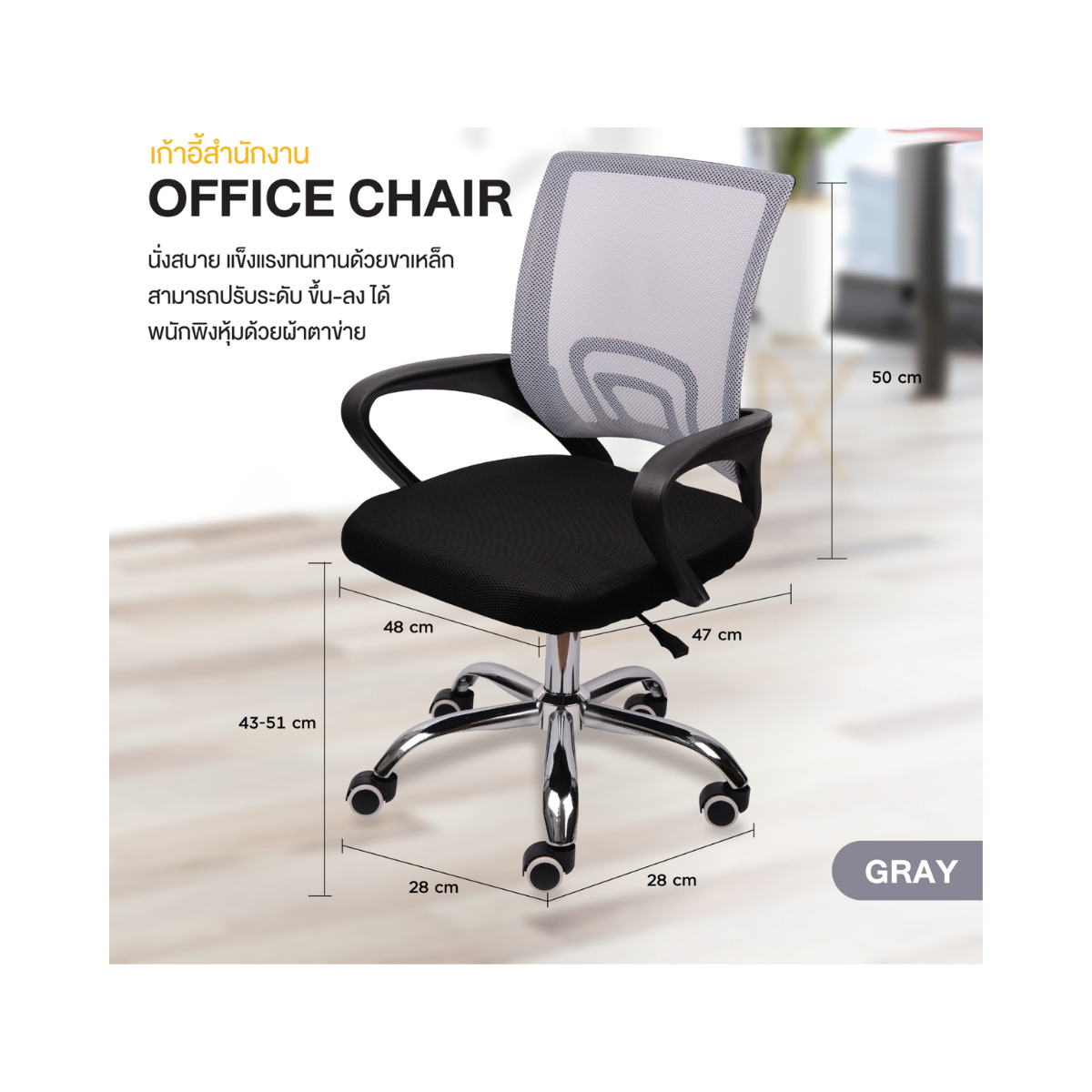 เก้าอี้สำนักงาน พนักพิงกลางหลัง ผ้าตาข่าย รับสรีระ ปรับระดับสูง-ต่ำ รับน้ำหนัก 100 kg ล้อเลื่อน หมุน 360 องศา วัสดุการผลิต : เหล็กชุบโครเมียม (Chrome Base), พลาสติก PP (Polypropylene), ผ้าตาข่าย (Mesh Fabric), ฟองน้ำ
