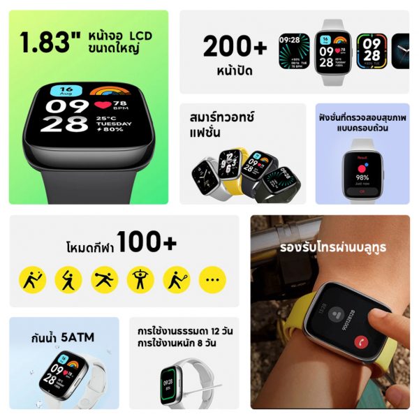 ① รองรับการโทรด้วยเสียง Bluetooth เชื่อมต่อนาฬิกากับสมาร์ทโฟนผ่าน Bluetooth รับสายบนนาฬิกาด้วยการแตะเพียงครั้งเดียว ไม่ว่าคุณจะทำงานหรือออกกำลังกาย คุณก็สามารถยกมือขึ้นเพื่อรับสายได้ ซึ่งเย็นกว่าและสะดวกกว่า